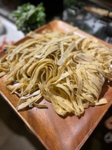 Once flattened, you have two options. If you don’t have a pasta maker, you’ll use a sharp knife to cut the flattened sheet into fettuccine. If you have a pasta maker, you’ll pass it through on the fettuccine setting. If I have the time, I prefer cutting the individual pieces because each one is slightly different. It’s a laborious process, but you can feel love in the result. Once you’ve completed this process, you should have a pile of some delicious-looking, fresh pasta, as seen to the right. Pro tip: as you’re laying the pasta down, lightly dust it with flour, so it doesn’t clump together.