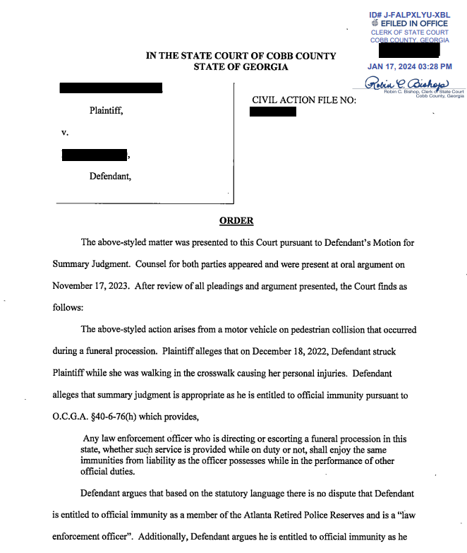 Rather than accept responsibility, the defendant denied fault and claimed immunity from suit. Although he had retired from the Atlanta Police Department several years earlier, he argued that he was entitled to official immunity under Georgia’s funeral procession statute because he was escorting a procession at the time of the collision.